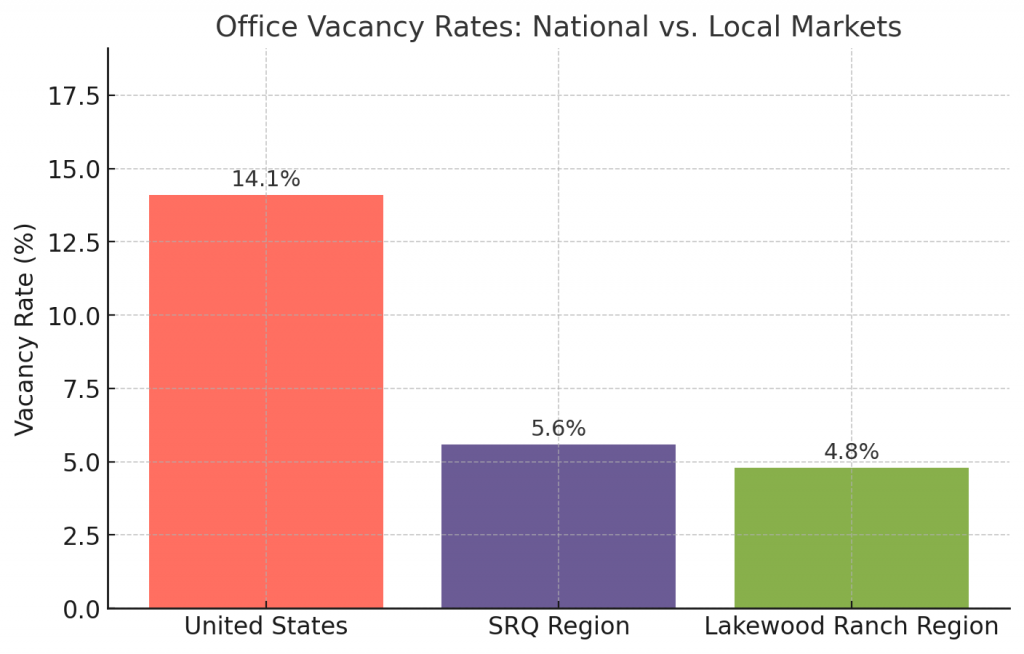 While the national office market shows a 14.1% vacancy rate, our local markets tell a very different story. The national vacancy rate is 2.52 times higher than our local rate. Strong demand and limited supply in Sarasota and Lakewood Ranch are keeping vacancy rates well below the national average.